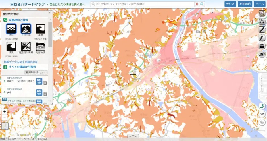 国交省「重ねるハザードマップ」の例(洪水マップ+土砂災害マップ)