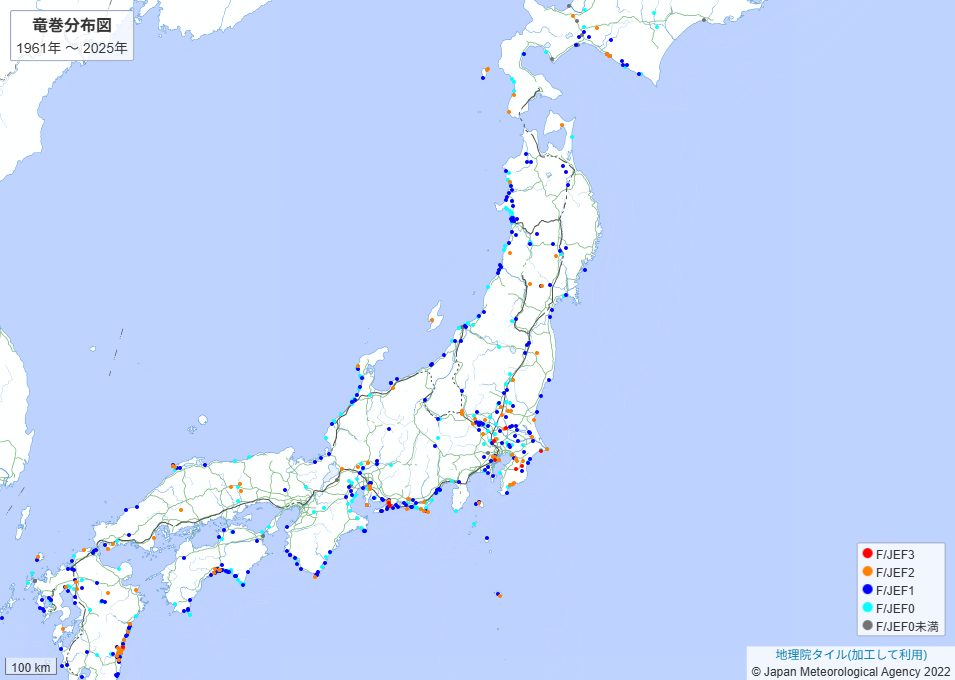 竜巻の強さは「日本版改良藤田スケール(JEFスケール)」という尺度で0〜5の6段階に分けられています。数字が大きくなるほど強くなりますが、国内で起きるほとんどの竜巻はJEF0〜1(弱いもの)です。静岡県牧之原市・吉田町の竜巻が相当するJEF3の竜巻は気象庁の1961年以降の統計では13例のみで、全国で見ると概ね5年に1回程度の発生となります。