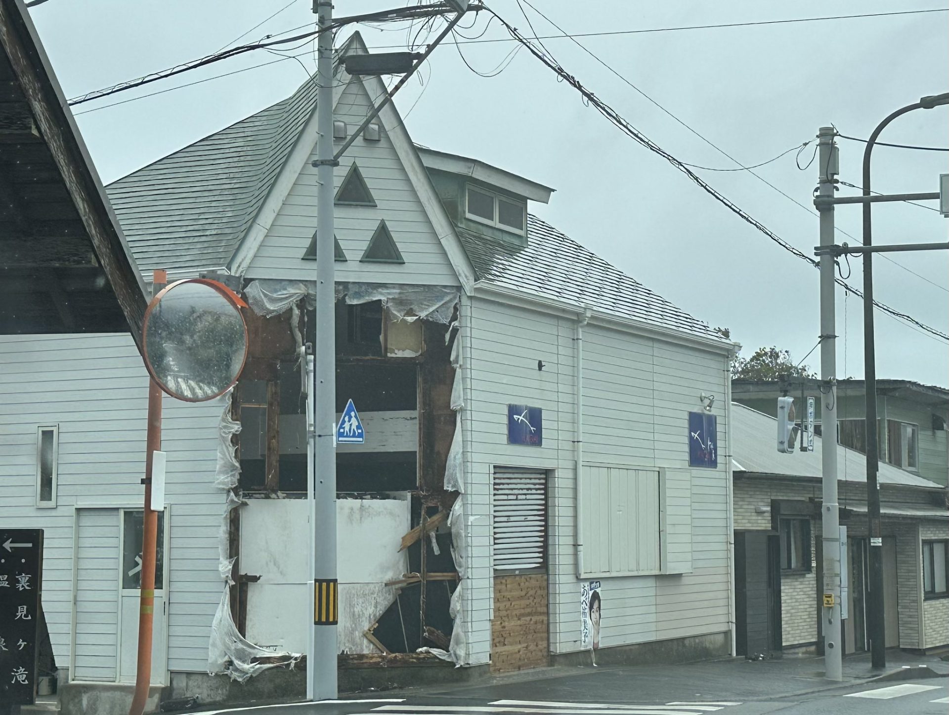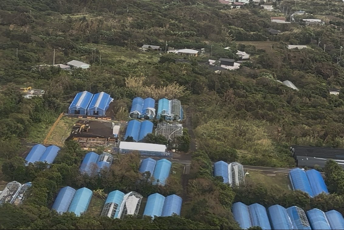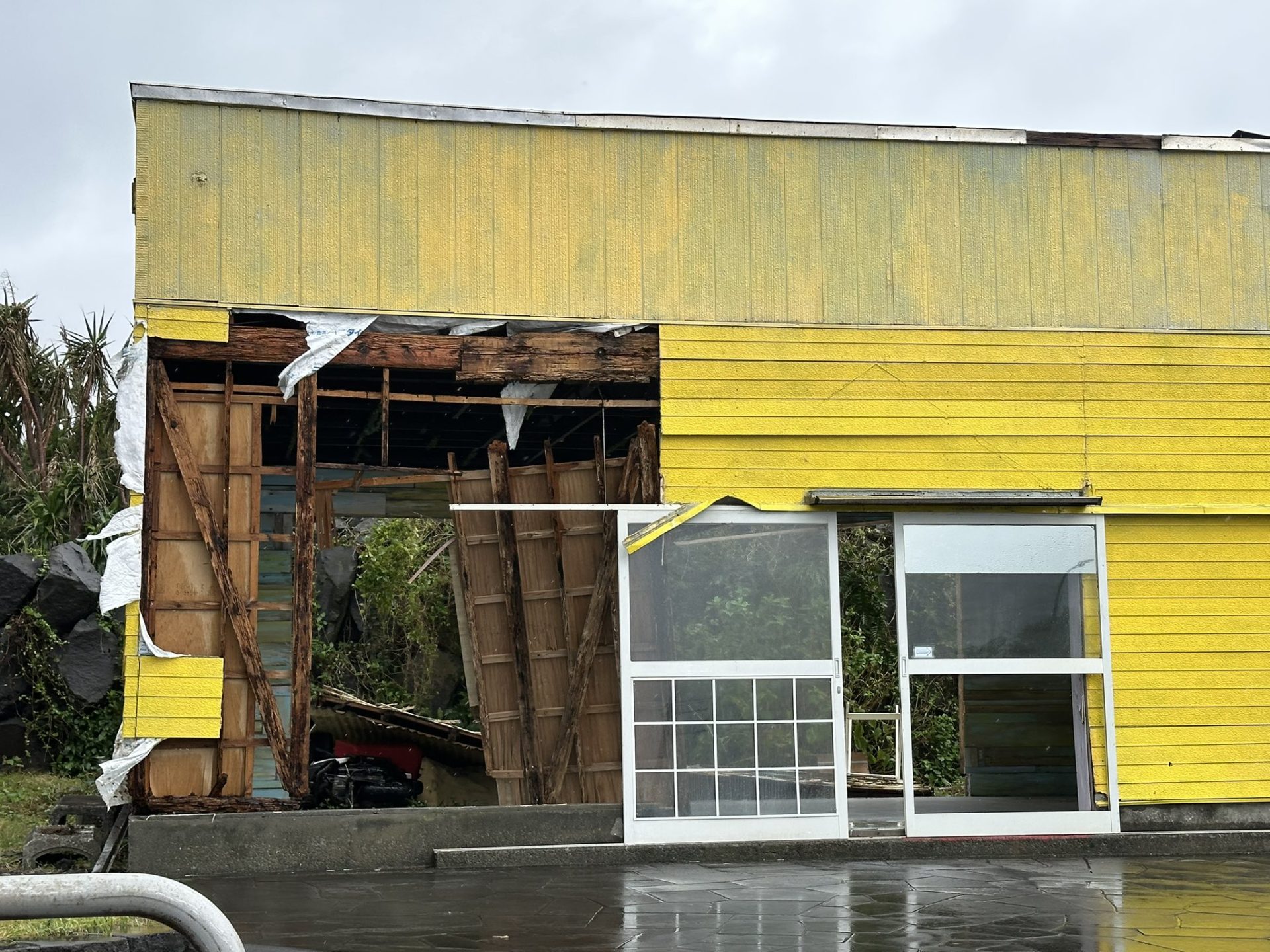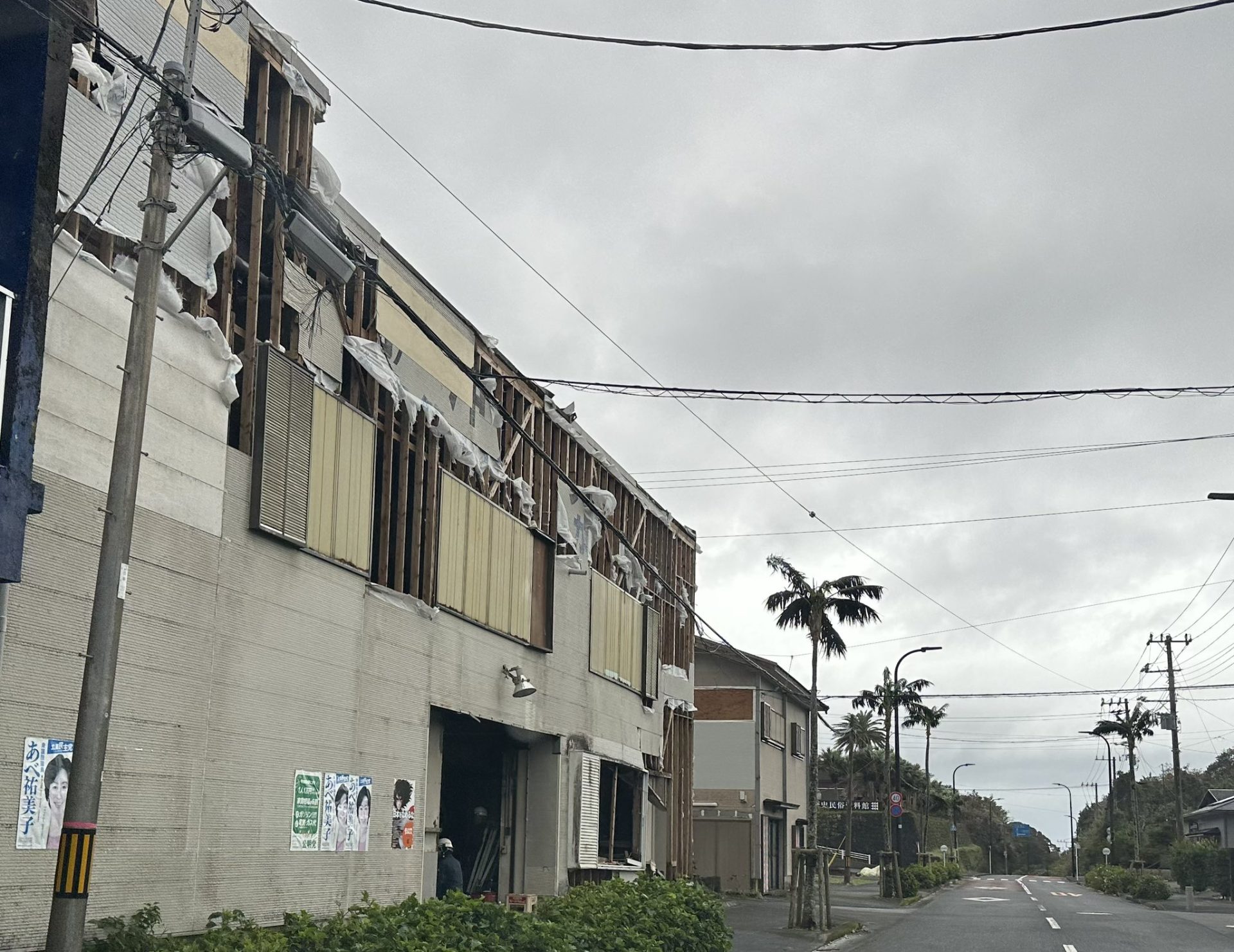 強風による建物被害は、島内の至る所に見受けられました。壁や屋根の破損が目立ち、壁材の飛散は比較的新しい断熱材などが入っている住宅にも見受けられました。農業用ビニールハウスなどの損傷も目立ちました。
