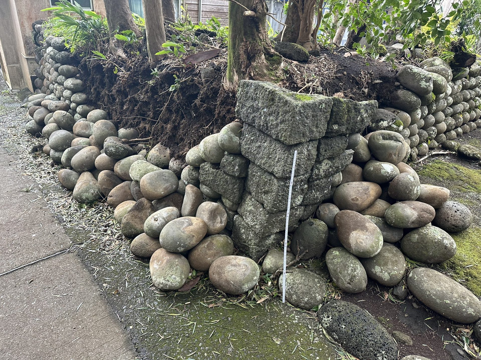 現地を確認した範囲では、大里地区の玉石垣に大規模な崩落はありませんでしたが、樹木の根がある擁壁上部などで、数か所の擁壁の崩落がみられました。近代的な鉄筋コンクリート造などの擁壁ではありませんが、記録的な豪雨にあってなおその姿をとどめている地点が多くみられました。