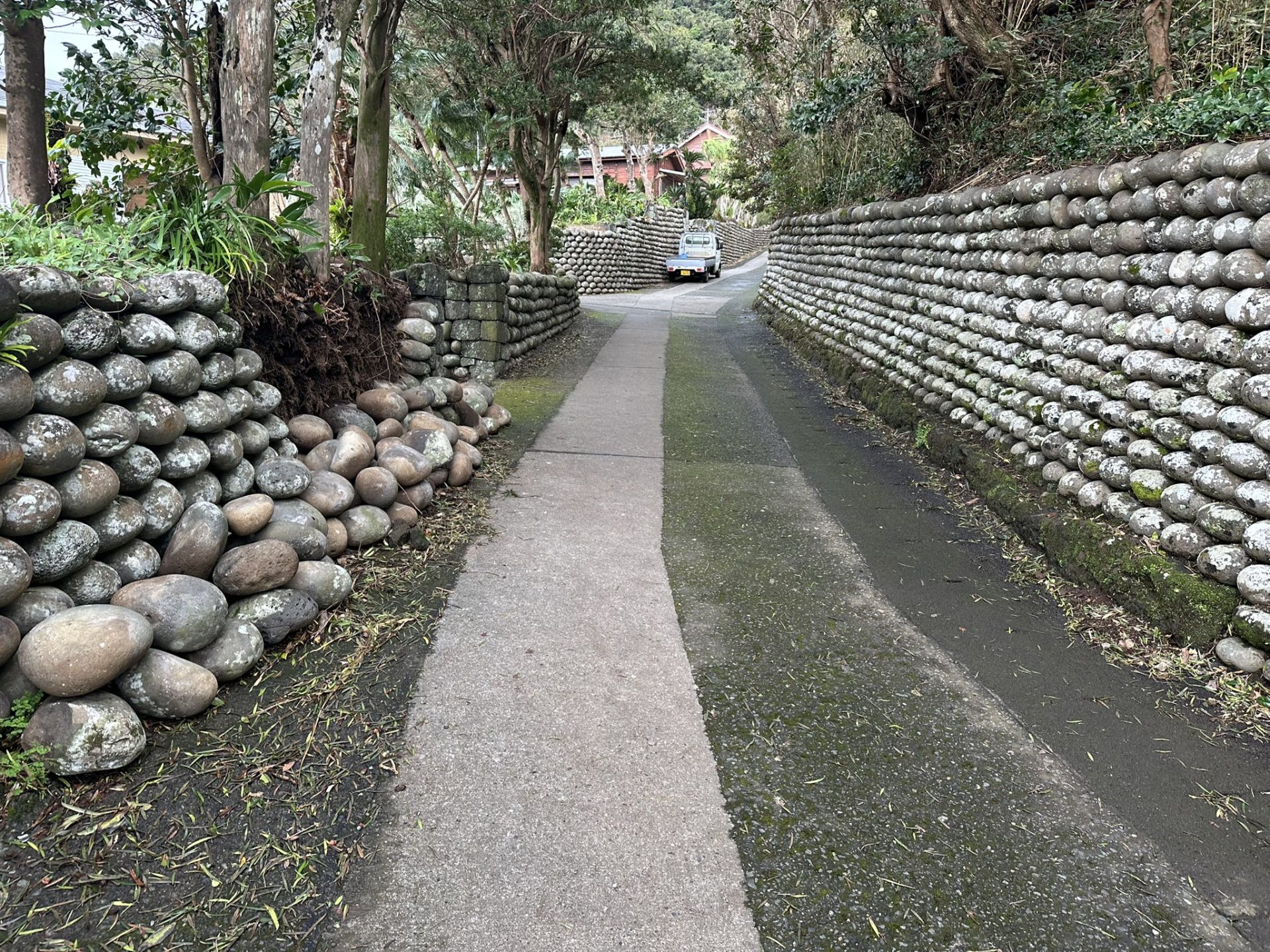 10月23日に現地を確認したところ、八丈島では、台風の豪雨、強風による被害が発生しています。島内で「大里の玉石垣」として知られる空石積み擁壁には、幾つかの地点で崩落の被害がありました。江戸時代に流された流人が海岸から運んで来た石材を使用したと言われ、「六方積み」と言われる、1つの石の周りに6個の石が接するように石を組み上げて数百年維持されてきたものでした。