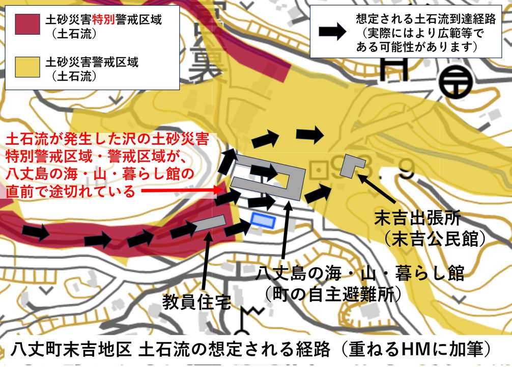 このことから、結果的には町の土砂災害ハザードマップで事前に定めていた「末吉公民館」の2階に避難をしていれば、「避難所に避難をした方が土石流に巻き込まれた」ということは起きなかったのではないかと考えられます。