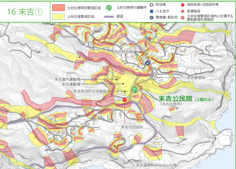次に、八丈町による、末吉地区の土砂災害ハザードマップを確認してみます。このマップでは、土石流に加えて「急傾斜地の崩壊」、いわゆるがけ崩れの土砂災害特別警戒区域、同警戒区域も同じ色合いで示されています。このことから、上で示した土石流のみの特別警戒区域、警戒区域より着色されている範囲は広くなっています。また、「八丈島の海・山・暮らし館」は、「末吉多目的交流施設」として記載されています。末吉地区では、末吉多目的交流施設(現・「八丈島の海・山・暮らし館」)に加えて、末吉公民館(末吉出張所)、末吉屋内運動場、末吉運動場、末吉分団詰所、末吉駐在所なども全て何らかの土砂災害警戒・特別警戒区域内として色がついていて、末吉郵便局のみギリギリ範囲外となっているようでした。