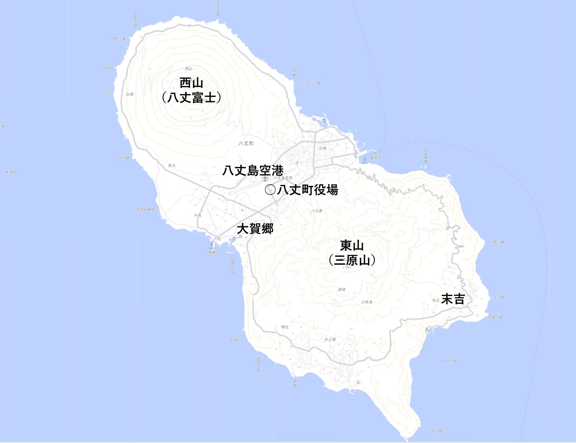 八丈島は、東京都庁から(八丈町役場まで)約285Kmほど南の太平洋上に浮かぶ、伊豆諸島南部の火山島です。北西の西山(八丈富士)と、南東の三原山(東山)という2つの火山からなるひょうたん型の島で、島の中心部である八丈町役場や八丈島空港などは、2つの火山の間の比較的平坦な土地にあります。