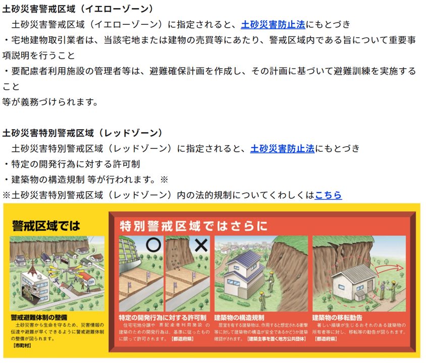 土砂災害特別警戒区域(通称:レッドゾーン)は、土砂災害が発生した場合に、建築物の損壊が生じ住民等の生命又は身体に著しい危害が生ずるおそれがあると認められる区域です。