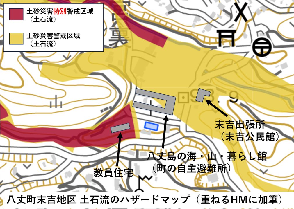 「重ねるハザードマップ」で末吉地区の土石流の土砂災害特別警戒区域(レッドゾーン)、土砂災害警戒区域(イエローゾーン)を表示した地図上に、それぞれの建物の位置を表示しました。すると、「教員住宅」は「建物の損壊や命に関わる危険が高い」土砂災害特別警戒区域(レッドゾーン)内にあり、「八丈島の海・山・暮らし館」はその一部が「警戒・避難が必要な災害が起こるおそれがある」土砂災害警戒区域(イエローゾーン)内に、「末吉出張所(末吉公民館)」も土砂災害警戒区域(イエローゾーン)内にあることがわかります。