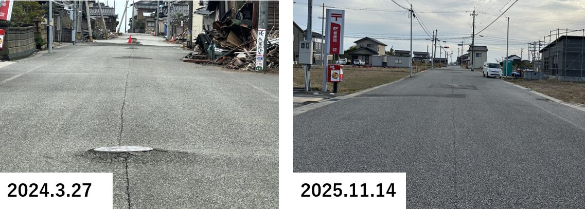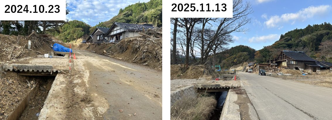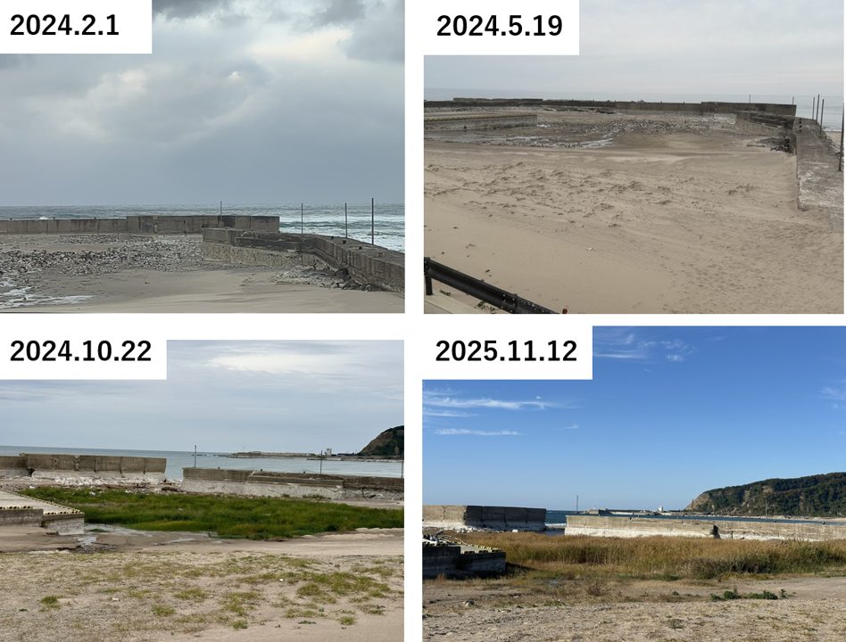 2023年5月の地震でも被害が大きかった珠洲市正院は、地震の揺れによる倒壊家屋が多く目立った地域であった。海に近く、特に沿岸部では地盤の液状化現象による噴砂、マンホールの突出、地盤の陥没等が発生していた。2024年3月に訪問時には倒壊家屋が残存しており、マンホールの突出もみられた。2025年11月には道路は綺麗に復旧してマンホール突出も解消、被災家屋は解体が進み、沿岸部では液状化噴砂も撤去されていたようであった。また、海岸部では護岸工事に関連するものか、工事が進められていた。