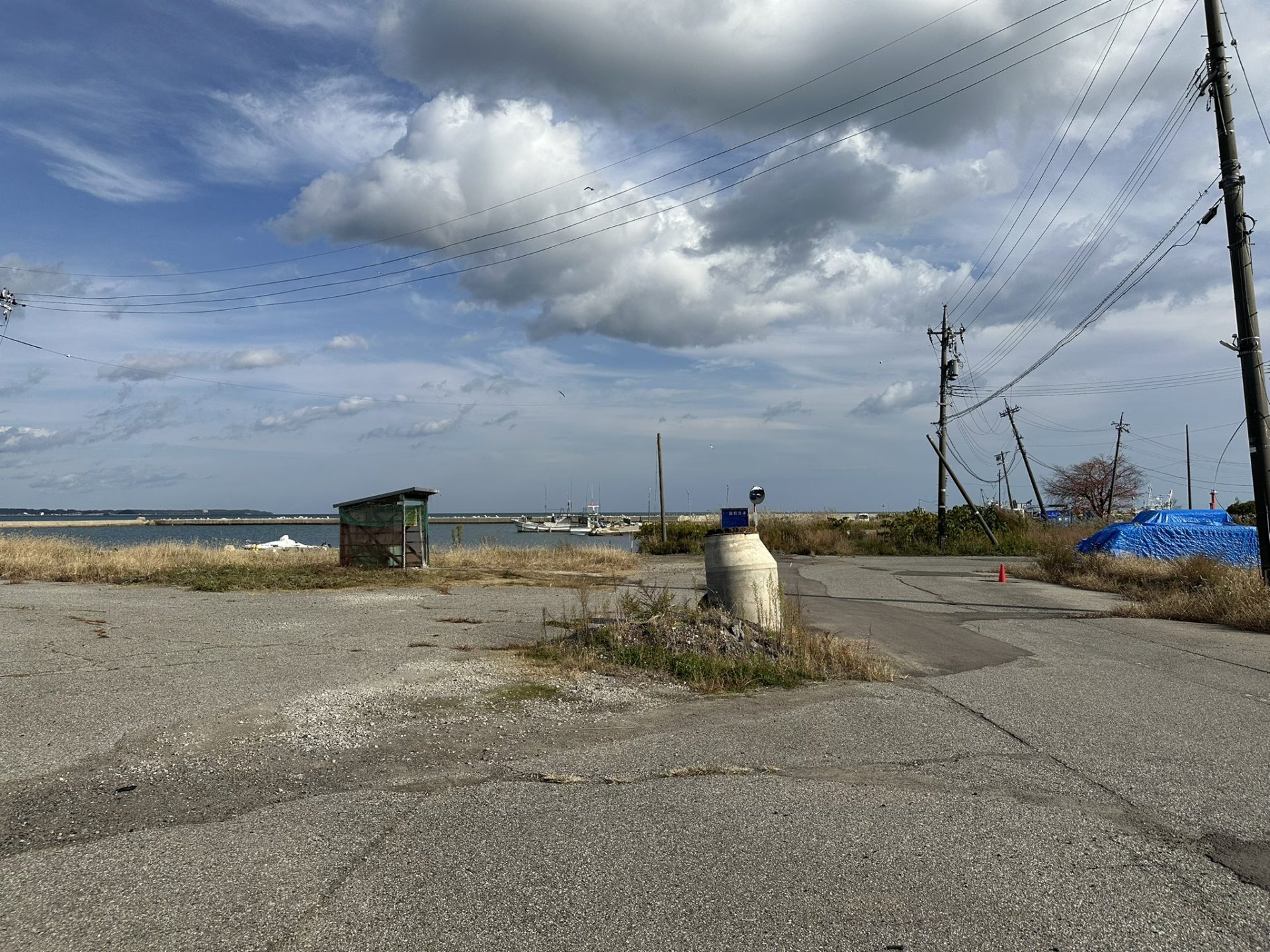 建物のほかにも、遅れ、見捨てられたと指摘される場所がある。一例として、新聞記事にもなった事例として、珠洲市内の突出マンホールの残置がある。この地点も復旧復興の遅れを示す性質のものではないと考える。突出マンホールが今も残存している原因としては、①十分に広さがある漁港近辺場所にあって、下の写真の通り通行や復旧復興の妨げとならないこと、②近隣の橋は通行不能になっており(代替ルート有り)車両の通行がなく訪れる人も少ないこと、③珠洲市の公共下水道事業の変更に伴い、周辺地域は下水道の対象区域から外れ、効率的・経済的な市町村設置型浄化槽設置への転換を進めていること、さらに④地域の在宅避難者には個別浄化槽を設置(出典:国総研HP)などといった、多くの人の妨げにはならず、かつ必要なケアは取られている状態であるとみられる。これだけ明瞭に突出していれば視認性も良く、事故などにも繋がりにくいだろう。