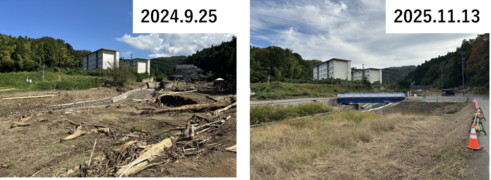 輪島市久手川町では、奥能登豪雨で地域を流れる塚田川を土砂・洪水氾濫とみられる濁流が遅い、4名の方が亡くなられている。写真右手側には流された住宅の痕跡も残っていた。2024年9月21日の豪雨から4日後に訪問した際にはまだ流れて来た流木や土砂は手つかずで、行方不明者の捜索も行われている状況であった。2025年11月になると川向こうの集合住宅へのルートだろうか、新たな橋がかけられており、辺りの流木などは撤去されていた。