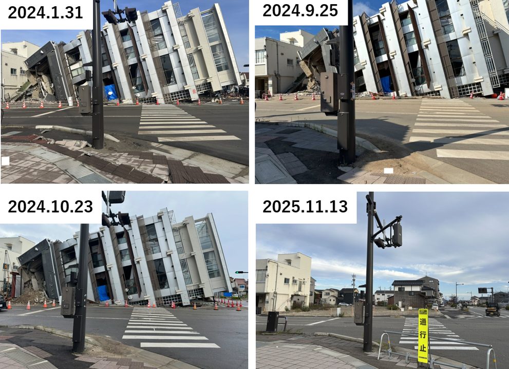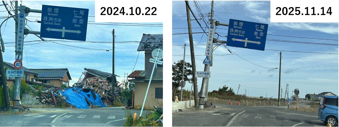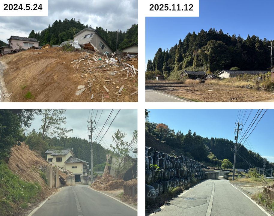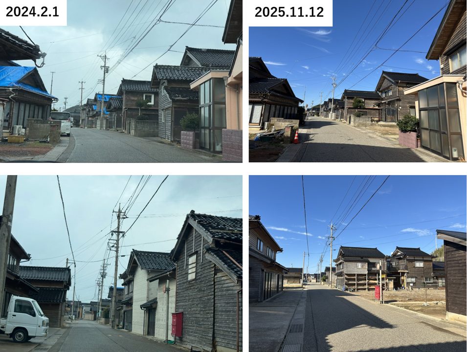 さらにそれから1年が経つ時期を前に、横山は11月12~14日の日程で奥能登2市2町を中心とした現地調査を実施した。その際は可能な限り、過去に訪問した場所がその後どのように変遷したかに着眼して、その変遷を追跡した。特に、石川県の報告では、公費解体は2024年10月末で申請の95%を完了しているとされているが、横山が2024年1月~10月の間に、能登地域における5回の調査で現地を見た際の写真との比較で、現地の光景がどのように変わっているかを視覚的に示した。また、SNS上の意見や現地の方の聞き取り、また公的公開情報などを総合して、復旧、復興の現状や課題などについて調査を実施した。