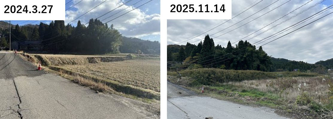 若山川の上流域では、「活断層か?」とも指摘された直線状の大きな段差があり、2024年3月に訪問した際には写真の地点では水田だった場所の地面が大きく傾いているようにみられていた。その後の研究により、川の両側の山の斜面が地震によって大規模に滑り落ちててできたものであるという論文が発表された(論文(英文))。2025年11月には水田は耕作されておらず、道路は確度が緩くなっているように見られた。大きな道ではないが、ちょうど北側からの道と南側の道をつなぐバイパスのような位置にあり、公費解体や復旧工事関連のトラックとみられるダンプトラックが多数行きかっていたが、これも復興の進捗の姿であろう。