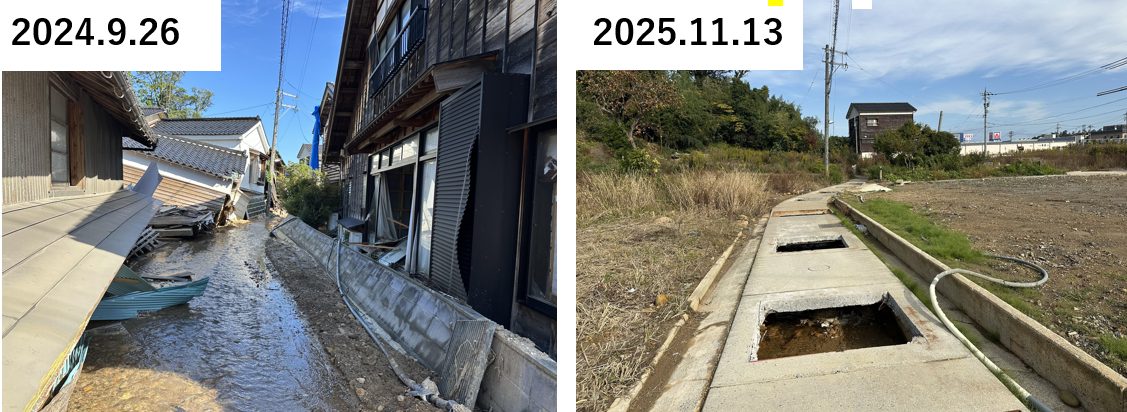 珠洲市の北側にある珠洲市大谷町付近は、2024年9月の奥能登豪雨の際、大規模な土石流被害に見舞われた地域である。2024年10月時点で道路は土砂が撤去されていたが、被災家屋は土砂が多く流入した状態で残置されていた。2025年11月には、土砂の撤去と家屋解体が段階的に進められていた。しかし、解体のみならず家屋内の土砂もあるためか、他地域に比べるとまだ未解体の家屋も残存していた状態にあった。