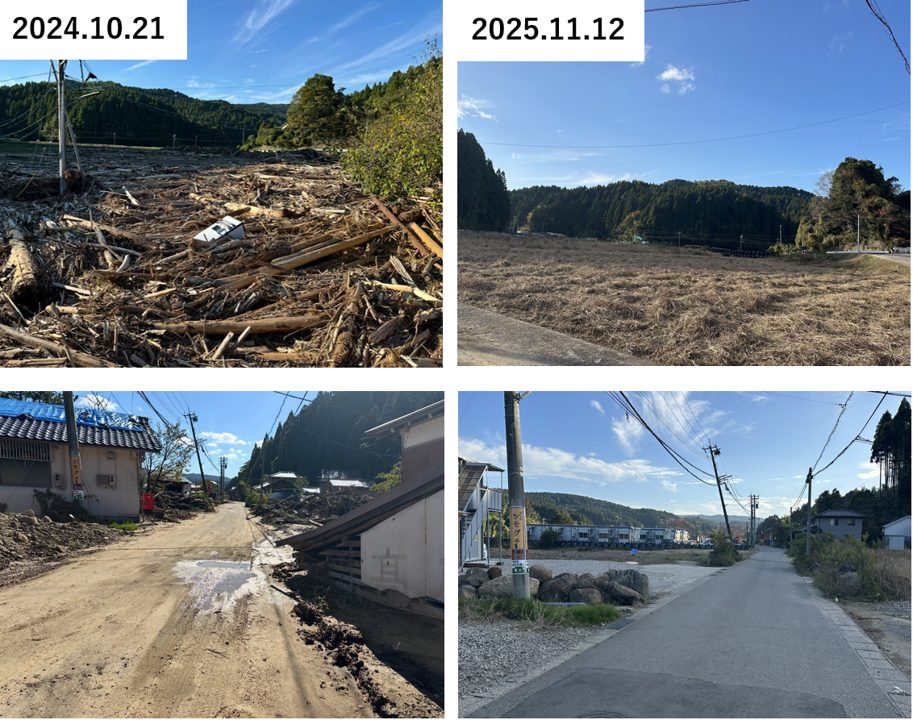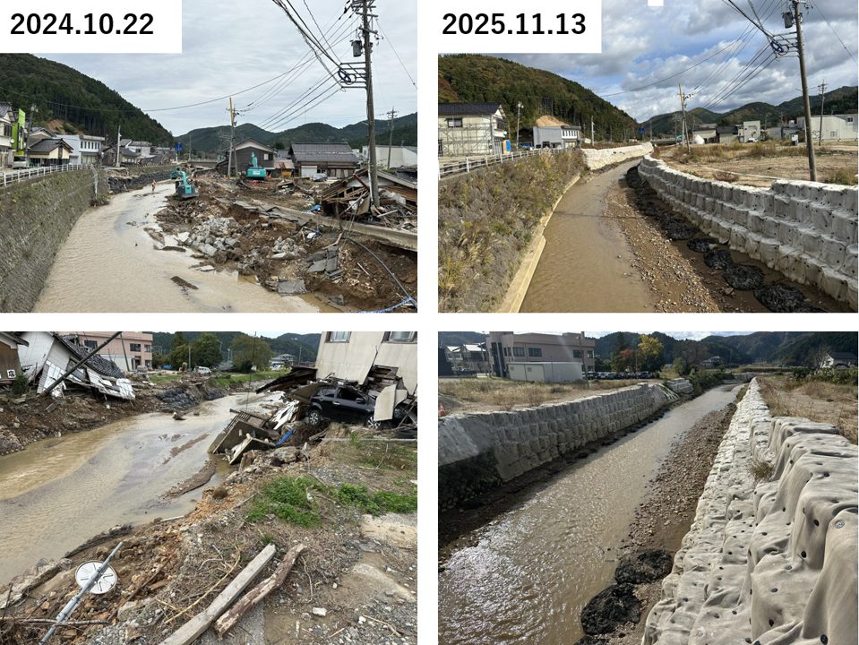 輪島市門前町の門前町浦上では、2024年9月の奥能登豪の際に大きな被害が発生していた。門前町を流れる八ケ川の支流である浦上川沿いでは、2024年10月に訪問した際には大量の流木や土砂が流れ込んでいた。民家付近に見渡す限り大量の流木、しかもかなり大きなものが流れ込んでおり、撤去には相当な労力を要することが見込まれた。2025年11月に訪問した際にはそれら流木や土砂は撤去され、周辺の被災家屋や建物(左下の写真、左側は郵便局)が解体が進んでいた。