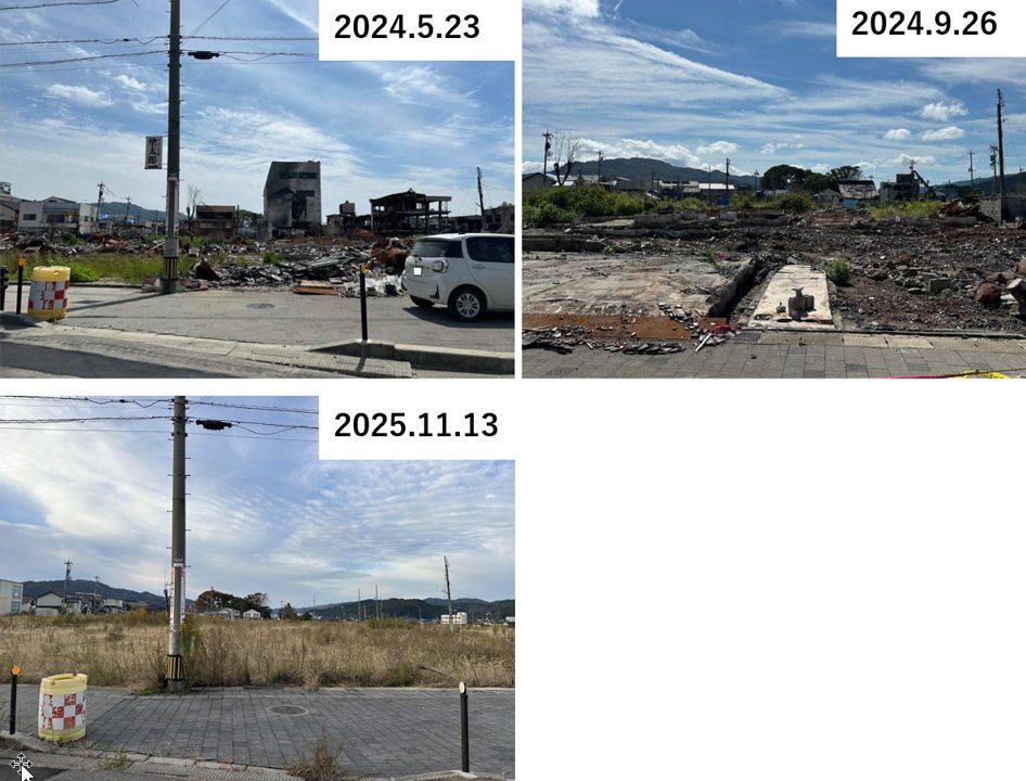 今年11月に訪れると全て解体は完了して更地となっていた。知らなければ、元々空き地であった場所のように感じてしまう。結果的に、この地点では地震発生から手つかずの状態の倒壊ビルが元日から10か月ほど残存していたことになった。SNSなどで「能登は見捨てられた」「復旧復興が遅い」という論が渦巻くが、その代表事例のようになってしまっていた感もある。しかし、実際には、ご遺族の意向によりビル倒壊原因の調査が行われたことなども影響していたことが明確である事例だ(出典:「原因を必ず究明してほしい」地震でビル倒壊し2人死亡…輪切りで建物解体へ)。しかし、そのような個別の事情を知らず、批判の材料になってしまっていた。実際に、このビルの「解体後」の様子について語られることは少ないように感じる。
