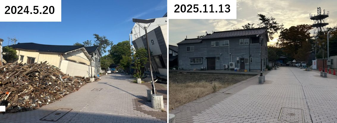 同じ河井町にある、「朝市通り」付近は、地震後の火災により焼失した地域である。2024年5月の段階ではまだ焼失した建物も残存していたが、他地域より先行して公費解体が進み、2024年9月の段階でかなり更地化が進んでいた。2025年11月には周囲の公費解体が終了し、現地は草原のようになっていた。輪島市は火災被害エリアで焼失したエリアで区画整理の準備を進めている段階で、どのような再建をしていくかは今後協議が進められる段階だ。輪島市は朝市通り周辺をシンボルプロジェクトと位置付けており、2030年度までに防災対策を強化して再建を目標としていることから、今後再建が進むことが期待される。