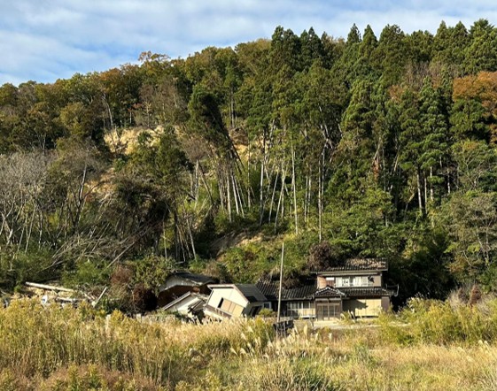 珠洲市の北側にある珠洲市大谷町付近は、2024年9月の奥能登豪雨の際、大規模な土石流被害に見舞われた地域である。2024年10月時点で道路は土砂が撤去されていたが、被災家屋は土砂が多く流入した状態で残置されていた。2025年11月には、土砂の撤去と家屋解体が段階的に進められていた。しかし、解体のみならず家屋内の土砂もあるためか、他地域に比べるとまだ未解体の家屋も残存していた状態にあった。