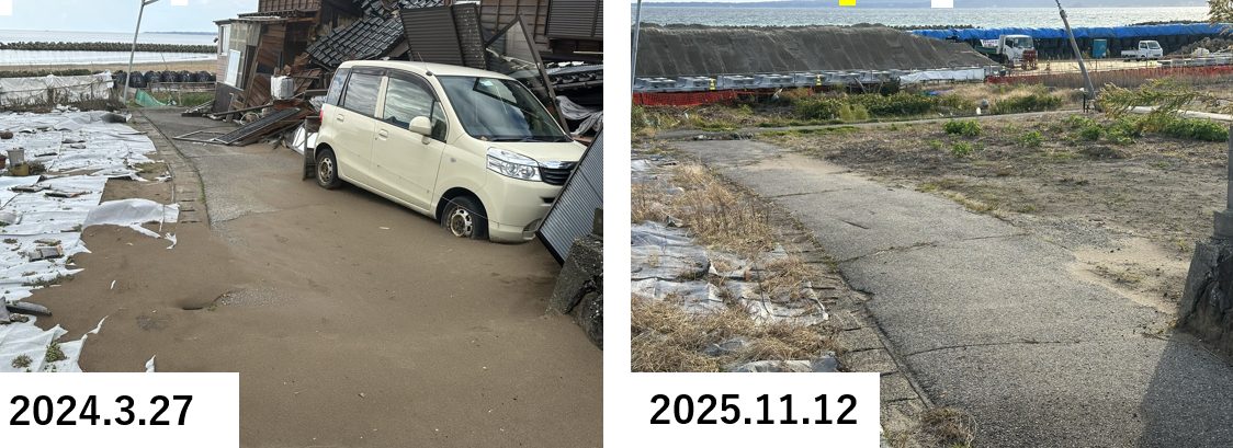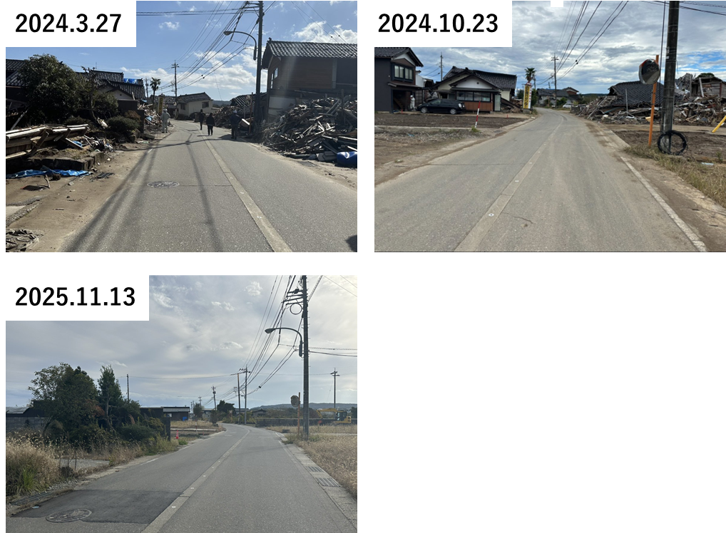 さらにそれから1年が経つ時期を前に、横山は11月12~14日の日程で奥能登2市2町を中心とした現地調査を実施した。その際は可能な限り、過去に訪問した場所がその後どのように変遷したかに着眼して、その変遷を追跡した。特に、石川県の報告では、公費解体は2024年10月末で申請の95%を完了しているとされているが、横山が2024年1月~10月の間に、能登地域における5回の調査で現地を見た際の写真との比較で、現地の光景がどのように変わっているかを視覚的に示した。また、SNS上の意見や現地の方の聞き取り、また公的公開情報などを総合して、復旧、復興の現状や課題などについて調査を実施した。