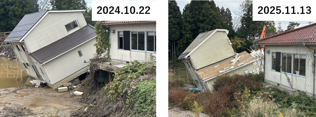 珠洲市若山町では、地域を流れる若山川ぞいで奥能登豪雨の際に河岸が浸食されたとみられる家屋があり、基礎地盤が失われることで川のほうに半分が転落するような被害がみられた。手前の建物は杭があるとみられることもあって、傾くなどは無く残存していた。2025年11月訪問時、半分が転落していた家屋では解体の重機が入っているところであった。建物が敷地外の河川にずり落ちていることもあって解体工事も困難であると想定されるが、こうした豪雨による被害が大きな家屋でも解体が進んでいた。