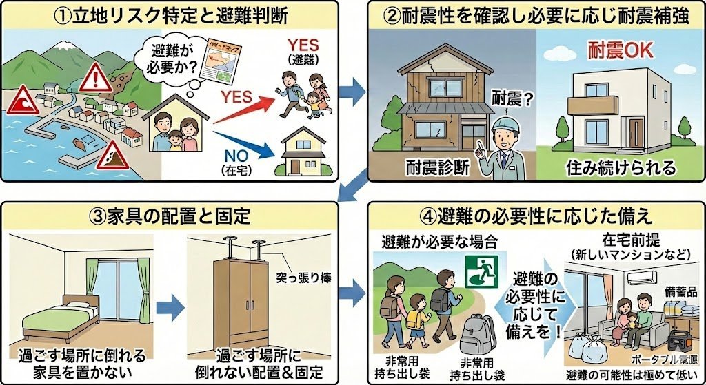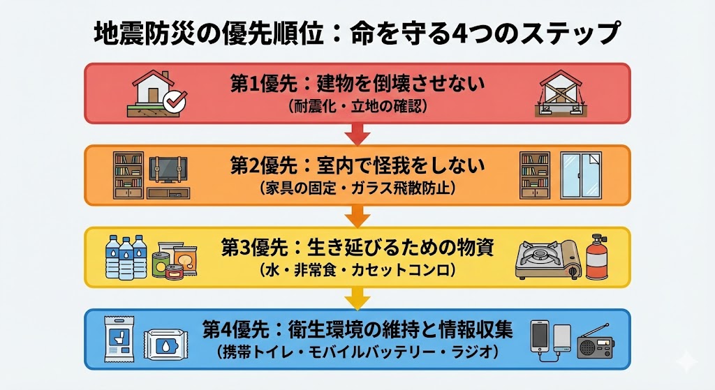 まずは「我が家の固有のリスク」を特定し、命に直結する根本的な部分から順に備えを行っていくことで、初めて実効性のある被害軽減(減災)が可能になるのです。建物倒壊を防ぎ、室内の怪我を防ぐことで怪我無く生存したのち、生き延びる備え、衛生環境を維持できる備えというステップを考えて欲しいと思います。どうか、以下の優先順位を参考にしてください。