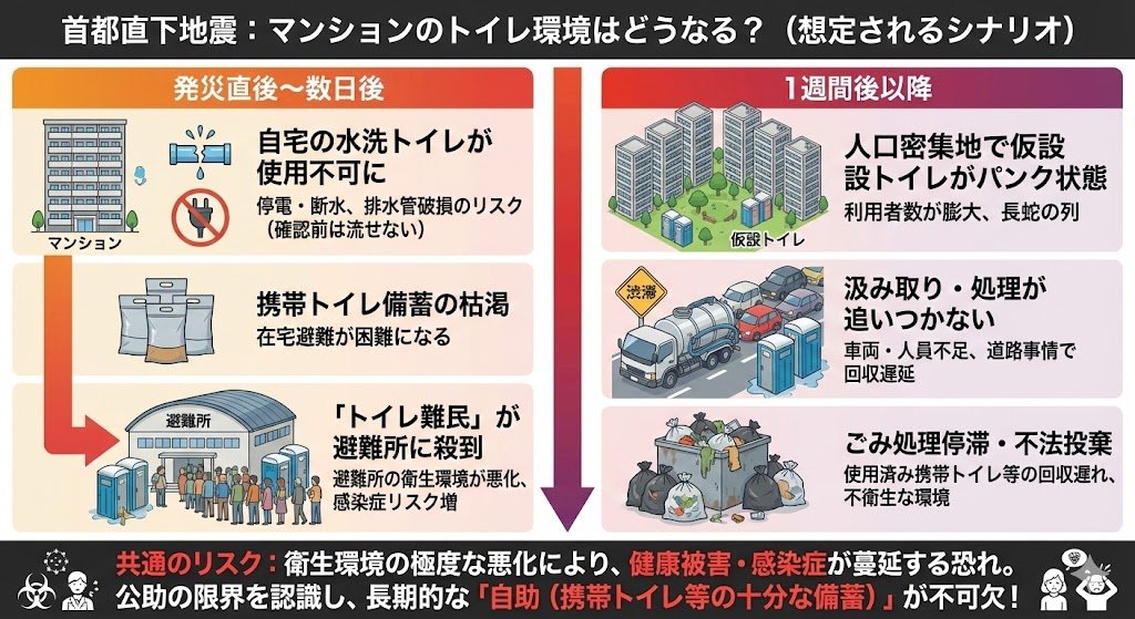 エレベーターは停電や損傷で使えない場合もあります。地域全体に被害が及べば、想像以上にインフラ復旧が長引くことも想定されます。近隣の避難所は既に人であふれてマンションに住む人々まで受け入れることはできない可能性も高いでしょう。トイレは圧倒的に不足する場合や使えなくなることもあります。そうした際、我が家でどう生活していくか。とくにトイレの備えについては各家庭でも備えておくことをお勧めします。