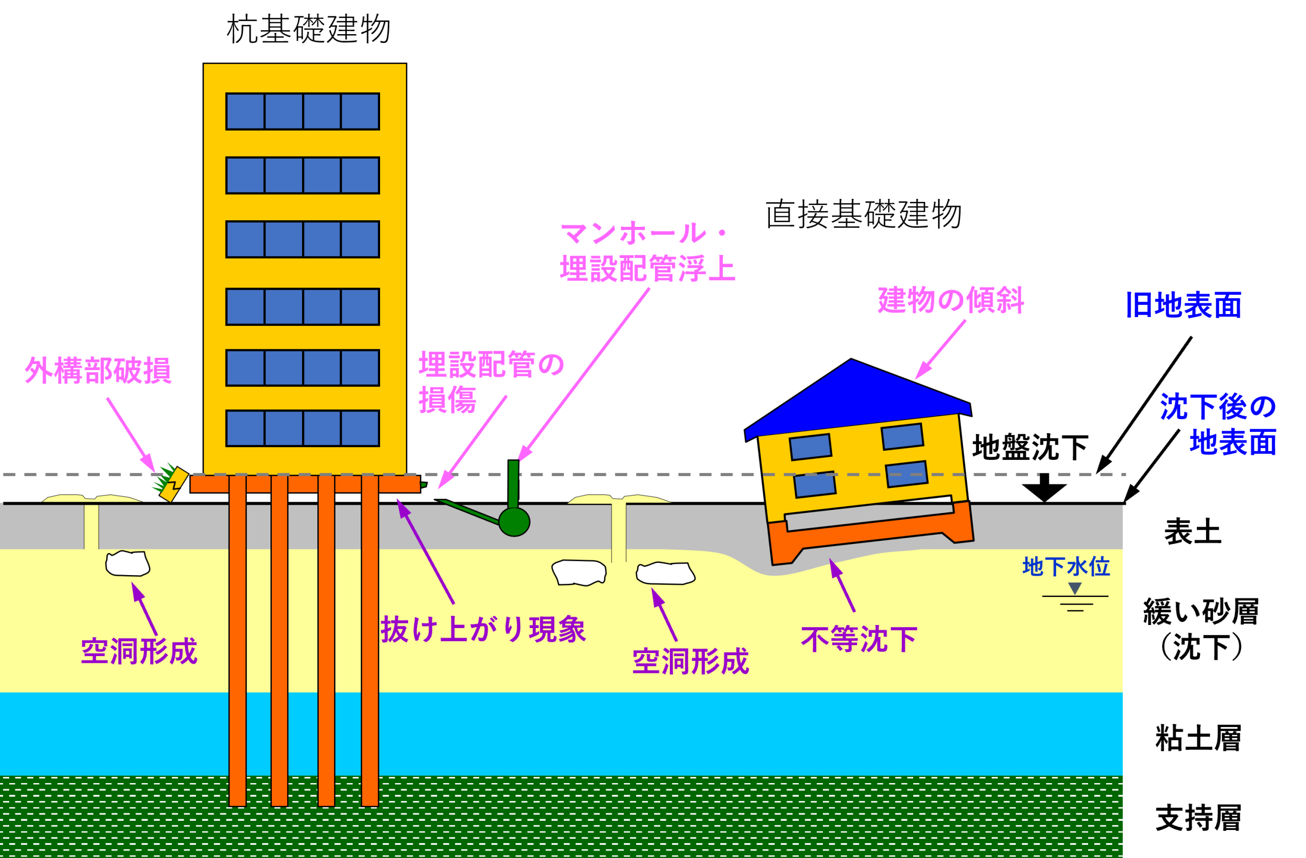 液状化現象: 地盤の液状化現象は、地下水が浅い(地表に近い)地域で、地盤に緩い砂の地盤の地域で発生しやすい傾向があります。埋立地や、昔川だった場所(旧河道)などはこの条件を満たすことが多く、液状化が起きやすい場所となります。液状化が発生すると、建物が不均等に沈み込んで傾く(不同沈下)だけでなく、地中の上下水道管やその家屋との接合部が損傷することがあります。