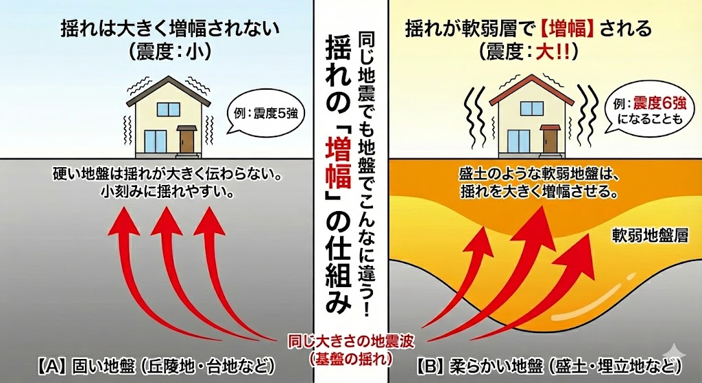 - 揺れやすい地盤:地震による建物の倒壊や損壊は、建物の耐震性能だけで決まるものではありません。「建物が建っている地盤の性質」が極めて重要な要素となります。 同じ耐震基準で建てられた家屋であっても、固い岩盤の上に建つ家と、柔らかい地盤の上に建つ家では、被害の程度に雲泥の差が生じました。軟らかい地盤は揺れを増幅させる「プリン」のような性質を持っています。同じ地震でも、硬い地盤であれば震度5強だったものが、軟弱な地盤では震度6弱、6強に大きくなってしまうようなこともあります。そうなると、より被害が発生しやすくなってしまいます。ご自宅の建物の強さを確認することはもちろんですが、「そもそも自分の家がどのような揺れやすい地盤の上に建っているのか」も大事なのです。能登半島地震では、輪島市街地で揺れやすい地盤の地域で多くの木造住宅被害があったというケースもあります。こちらの記事「令和6年能登半島地震から1年! 見えてきた3つの課題と教訓」でも紹介しています。揺れやすい地盤の地域の住宅では、耐震性の確保が急がれます。新築でも耐震等級3や制振ダンパーの装着などをお勧めします。