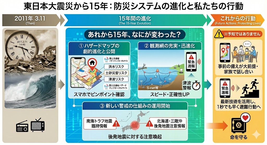 東日本大震災以降、日本の防災システムも決して立ち止まっていたわけではありません。むしろ、被害を減らすという熱意と技術の進歩もあって、地震・津波観測網の充実や、ハザードマップや地震臨時情報などでも整備が進んでいます。