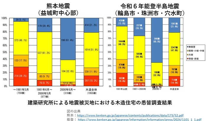 地震による木造住宅の被害は、その耐震基準によって大きく異なることが現状です。直下の活断層を原因とする地震であった熊本地震(益城町中心部)、能登半島地震における、木造住宅の悉皆調査による事例を紹介します。