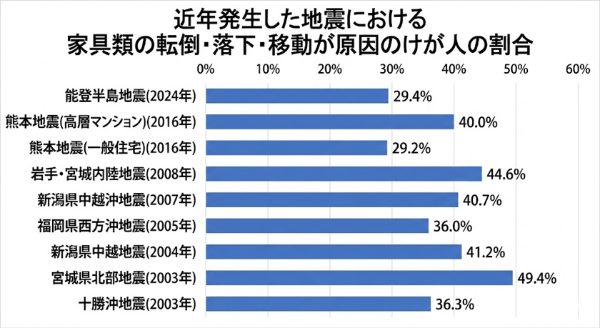 近年発生した地震のけが人の割合のうち、およそ3割~5割ほどが、家具類の転倒・落下・移動が原因とされています。次に多いのはガラス類の破損によるものであり、これらの被害を抑えることが、地震による怪我を防ぐことに大きく影響します。