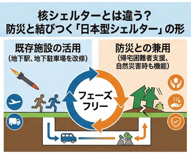 さらに、「日本型シェルター」と呼ばれる現実的かつ独自のハイブリッドな形での構想が進んでおり、その最大の特徴は、「既存施設の活用」と「自然災害(防災)との兼用(デュアルユース)」という2つの柱にあります。