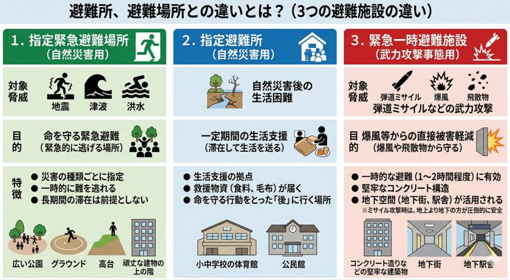 私たちが普段「避難」という言葉を使う際、多くの人が思い浮かべるのは、地震が起きた後の小学校の体育館や、津波警報が出た際に向かう高台などでしょう。しかし、災害対策基本法に基づく自然災害用の避難施設と、国民保護法に基づく武力攻撃事態用の避難施設は、目的も想定する脅威も全く異なります。いざという時に混乱しないためにも、これらの違いを明確に理解しておくことが重要です。