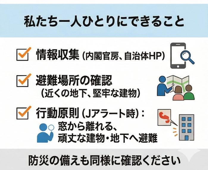 私たち一人ひとりが今すぐできることは、決して難しくありません。まずは、内閣官房の「国民保護ポータルサイト」や各自治体のホームページにアクセスし、自宅や職場、よく行く場所の近くにある「緊急一時避難施設」がどこなのかを検索してみることです。そして、その建物の特徴(地下があるか、堅牢な造りか)を把握しておくことです。